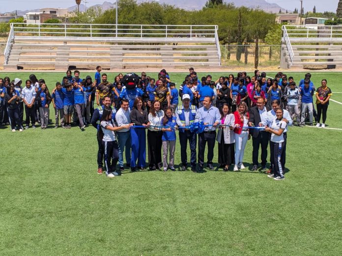 Delicias.- Con entusiasmo por parte del alumnado, se llevó a cabo la entrega oficial de la nueva cancha de fútbol rápido con pasto sintético y gradas en la Escuela Secundaria Estatal No. 3014, en un evento encabezado por el secretario de Educación y Deporte del Estado, Hugo Francisco Gutiérrez Dávila, y el presidente municipal Jesús Valenciano García.