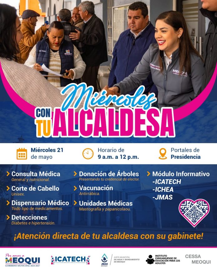 Meoqui.- Este próximo miércoles 21 de mayo, la alcaldesa de Meoqui, Miriam Soto y su equipo atenderán a los meoquenses sin previa cita en el Programa “Miércoles con tu Alcaldesa” en los Portales de la Presidencia Municipal, en un horario de 9 de la mañana a 12 del mediodía, donde además se brindarán diversos servicios como atención médica, dispensario médico, corte de cabello, detecciones de diabetes e hipertensión, donación de árboles, vacunación antirrábica, así como también la Unidad de Mastografías de Gobierno del Estado.