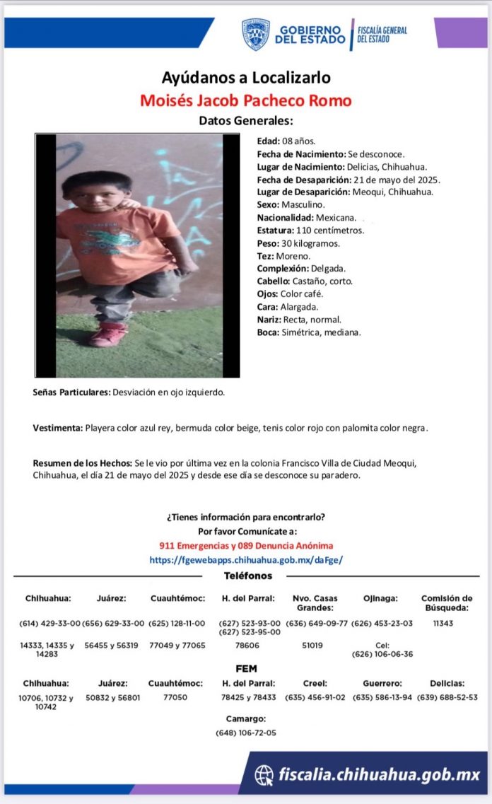 Meoqui.- La familia de Moisés Jacob Pacheco Romo, un niño de 8 años de edad, solicita la colaboración de la ciudadanía para localizarlo. Moisés desapareció el pasado 21 de mayo en la colonia Francisco Villa de Ciudad Meoqui, Chihuahua.