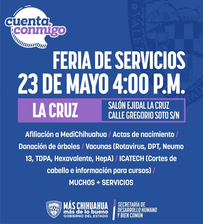 Camargo.- La Secretaría de Desarrollo Humano y Bien Común (SDHyBC), dio a conocer que el día de mañana se llevará a cabo la Feria de Servicios “Cuenta Conmigo”, en el municipio de La Cruz, con el propósito de acercar múltiples atenciones a la población que lo requiera.