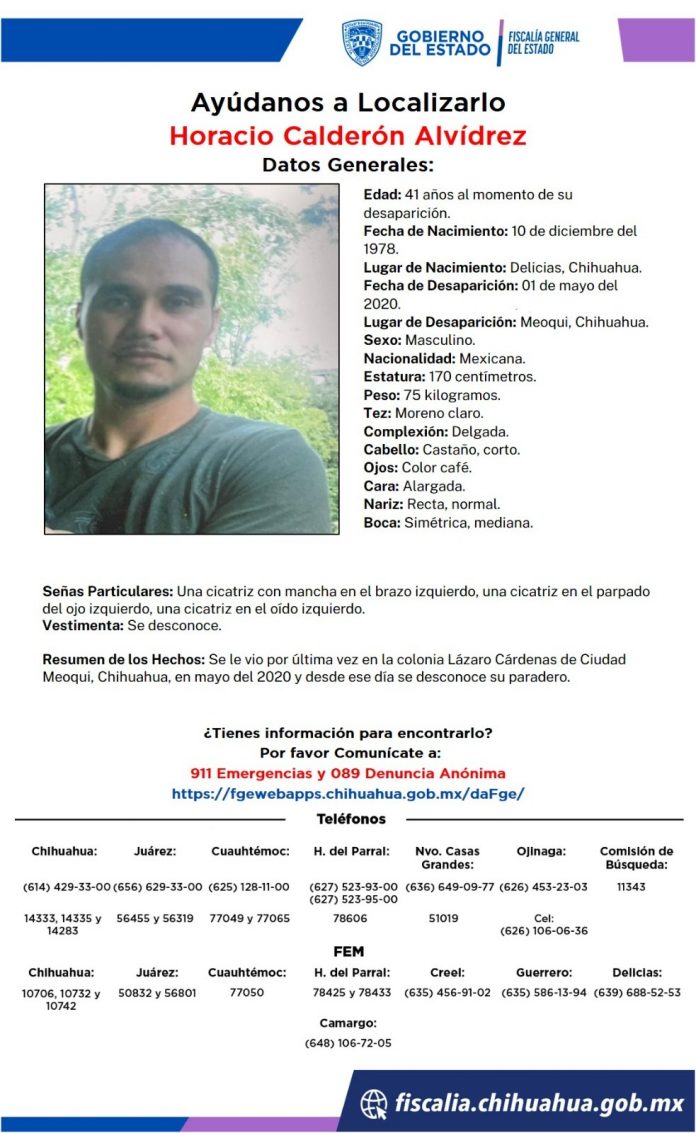 Meoqui.- La Fiscalía solicita ayuda para encontrar a Horacio Calderón Alvídrez, quien desapareció a sus 41 años el primero de mayo del 2020 en una colonia de Meoqui. Por ahora se desconoce su paradero.