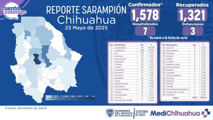 Chihuahua.- La Secretaría de Salud, a través del Departamento de Epidemiología, informó que los casos de sarampión continúan en aumento, registrándose hasta el 23 de mayo un total de mil 578 contagios en 38 municipios del estado.