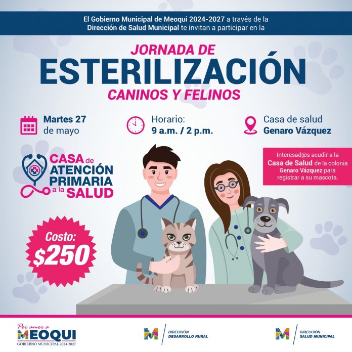 Meoqui.- Este martes 27 de mayo se llevará a cabo en la Casa de Atención Primaria a la Salud de la Col. Genaro Vázquez una jornada de esterilización para mascotas a bajo costo por parte del Gobierno Municipal de Meoqui a partir de las 9 de la mañana hasta las 2 de la tarde.