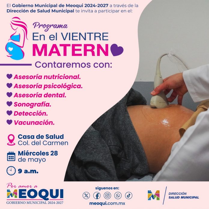 Meoqui.- Este miércoles 28 de mayo, se llevará a cabo una jornada del programa “En el Vientre Materno” a partir de las 9 de la mañana en la Casa de Atención Primaria a la Salud de la Col. Del Carmen, en la que se brindarán servicios como ultrasonido, asesorías psicológicas, nutricionales, vacunación, detección y estimulación prenatal de forma gratuita.