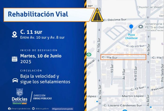 Delicias.- La Dirección de Obras Públicas del Municipio de Delicias informó que a partir de este martes 10 de junio se dará inicio a los trabajos de rehabilitación vial en la Calle 11 Sur, en el tramo comprendido entre las avenidas 10 Sur y 8 Sur, por lo que se implementará una desviación temporal en esta zona.