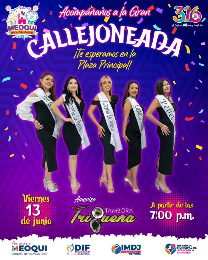 Meoqui.- En el marco de los festejos por el 316 aniversario de la fundación del municipio de Meoqui, este viernes 13 de junio a partir de las 7 de la tarde, se llevará a cabo la tradicional callejoneada con las canditadas a Reina de la Feria San Pedro y San Pablo 2025, teniendo como punto de partida la Plaza Principal frente a Presidencia Municipal.