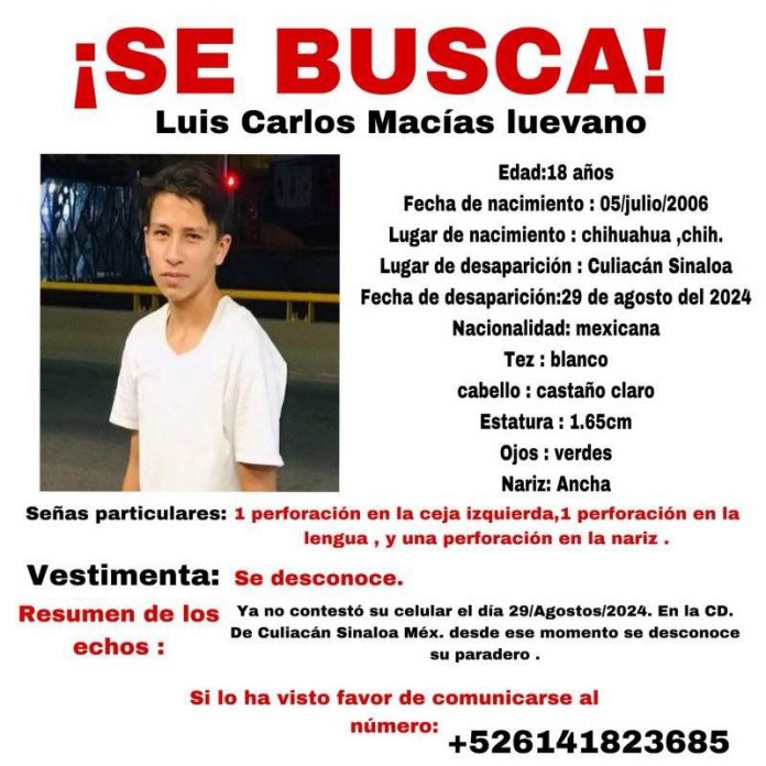 Chihuahua.- La familia de Luis Carlos Macías Luevano, un joven de 18 años originario de Chihuahua, está desesperada por encontrarlo después de que desapareciera el 29 de agosto del 2024 en Culiacán, Sinaloa.