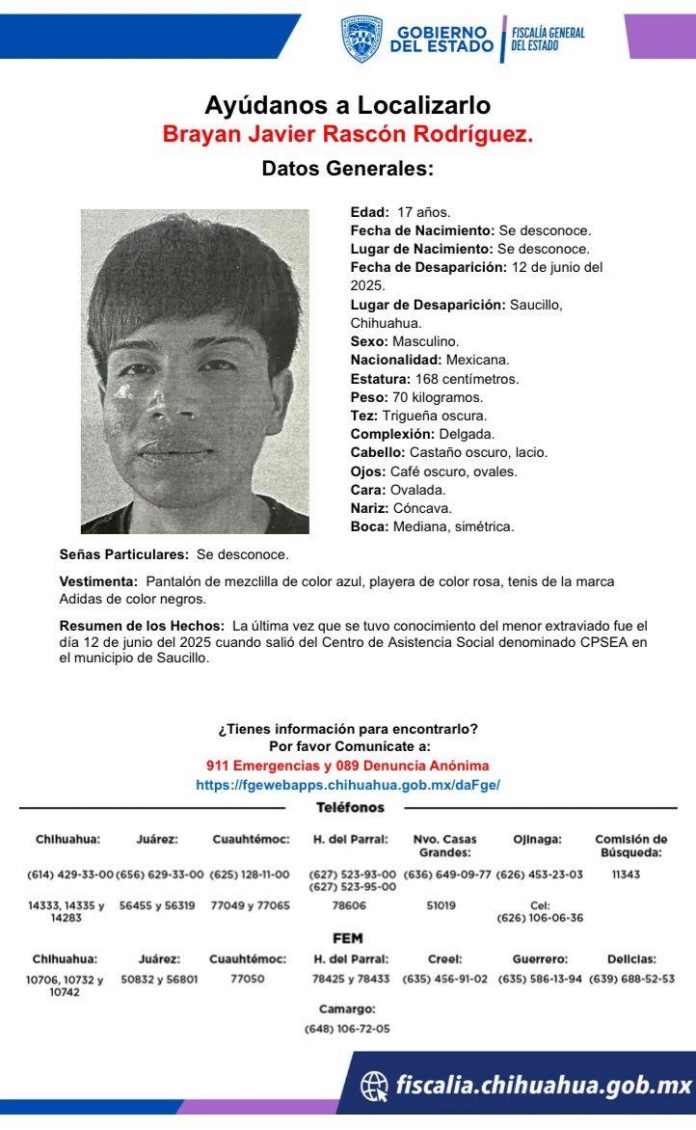 La última vez que se tuvo conocimiento de Brayan fue cuando salió del Centro de Asistencia Social CPSEA en Saucillo.