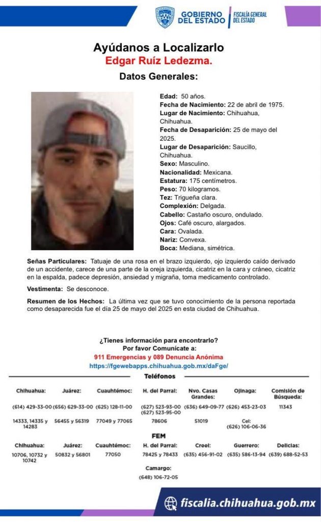 La última vez que se tuvo conocimiento de Edgar fue el 25 de mayo de 2025 en Saucillo.
