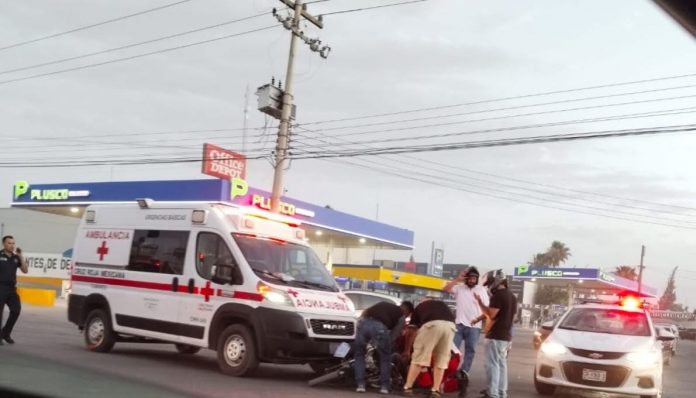 Delicias.- Un aparatoso accidente vial ocurrió la tarde del miércoles en el sector oriente de Delicias, cuando una ambulancia de la Cruz Roja Mexicana, delegación Camargo, impactó a un motociclista en la intersección de la avenida Séptima Oriente, Río Conchos y Cuarta Oriente.