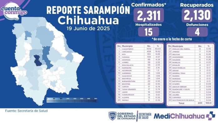 Los casos de sarampión están distribuidos de la siguiente manera: Cuauhtémoc, mil 014; Chihuahua, 458; Nuevo Casas Grandes, 159; Ojinaga, 108; Ahumada, 99; Riva Palacio, 59; Ciudad Juárez, 59; Namiquipa, 50; Ascensión, 30; Guerrero, 25; Guachochi, 25; Bachíniva, 24; Buenaventura, 22; Bocoyna, 22; Carichí, 17; Casas Grandes, 17; Janos, 16; Cusihuiriachi, 14; Aldama, 13; Meoqui, 9; Parral, 8; Jiménez, 7; Delicias, 6; Guazapares, 6; Galeana, 6; Morelos, 5; Rosales, 4; Gran Morelos, 4; Urique, 3; General Trías, 3; Madera, 3; Nonoava, 3; Batopilas, 3; Ocampo, 2; Aquiles Serdán, 2; Guadalupe y Calvo, 2; Balleza, 1; Camargo, 1; Julimes, 1; San Francisco de Borja, 1.