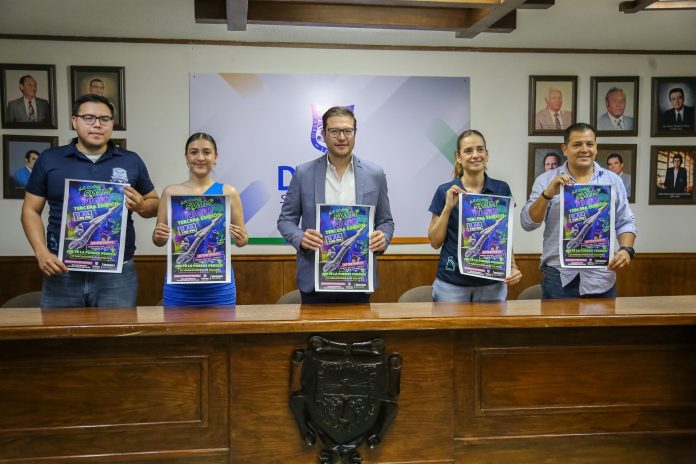 Delicias.- En rueda de prensa encabezada por el director del Instituto Municipal del Deporte y la Juventud (INMUDEJ), Miguel Aguirre, y el regidor encargado de despacho Mario Mata Licón, se anunció la tercera edición de la Copa Swim Night, un evento único que combina competencia acuática con una experiencia nocturna llena de música y luces. El evento se llevará a cabo el próximo 12 de julio a las 7 de la tarde en el Polideportivo Bicentenario Delicias.
