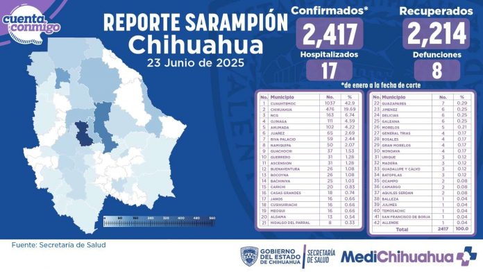 Chihuahua.- La Secretaría de Salud, a través del Departamento de Epidemiología, informó que los casos de sarampión continúan en aumento en el estado, registrando hasta este 23 de junio un total de 2,417 contagios y 17 personas hospitalizadas.