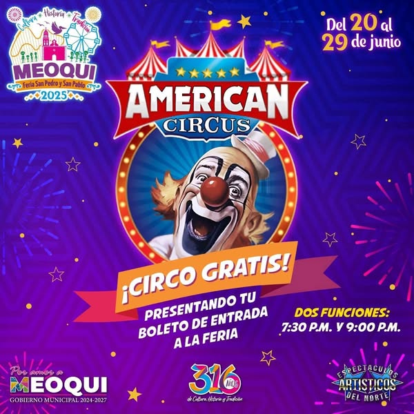 Meoqui.- Este martes 24 de junio, toda la familia podrá disfrutar de la función gratuita del circo en la Feria San Pedro y San Pablo Meoqui; además, la entrada estará al 2×1 hasta el jueves 26 de junio.
