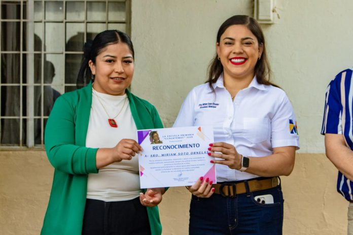 “Muy contenta de estar aquí dando la bienvenida a los alumnos en estos últimos días de clases y atendiendo una necesidad urgente. Con apoyo del coordinador regional de educación, Ricardo Robles, y gracias a la gestión ante nuestra gobernadora, se lograron 10 cubetas de impermeabilizante para mejorar las condiciones del aula afectada”, expresó la alcaldesa, quien también recibió un reconocimiento por su constante apoyo a las instituciones educativas del municipio.