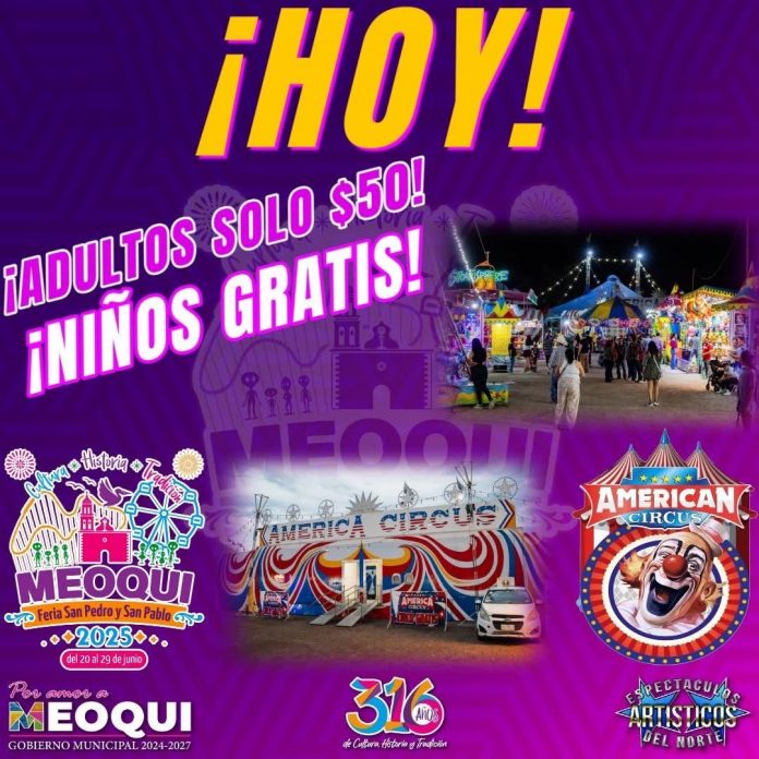 Meoqui.- Este 26 de junio, los niños entran gratis a la Feria San Pedro y San Pablo de Meoqui y los adultos pagan sólo 50 pesos, contando además con circo completamente gratuito con el boleto de acceso con dos funciones, siendo la primera a las 7:30 de la tarde y la otra a las 9:00 de la noche, así como también áreas gastronómicas, los tradicionales juegos mecánicos, expo de emprendedores “Produciendo con Amor”, actividades infantiles y mucho más.