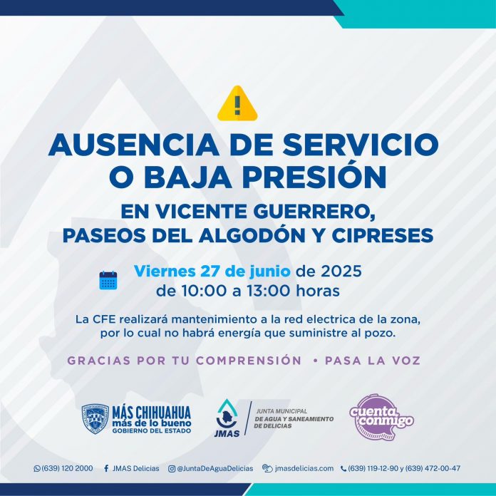 Delicias.- La Junta Municipal de Agua y Saneamiento (JMAS) de la ciudad ha anunciado una interrupción temporal en el servicio de agua potable en las colonias Vicente Guerrero, Paseos del Algodón y Cipreses. La suspensión del servicio se debe a trabajos de mantenimiento programados por la Comisión Federal de Electricidad (CFE) en la red eléctrica de la zona.