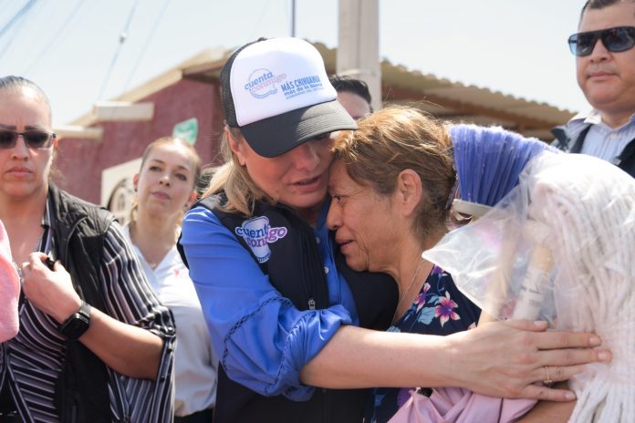 Chihuahua.- La Gobernadora Maru Campos encabezó en Ciudad Juárez un recorrido por colonias de los sectores poniente y norponiente, que resultaron afectadas por las lluvias registradas durante las últimas horas y entregó apoyos diversos a las familias damnificadas.