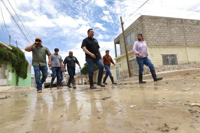 CIUDAD JUÁREZ.- Como parte del recorrido que llevó a cabo el Presidente Municipal, Cruz Pérez Cuéllar, acompañado de su esposa la presidenta del Sistema para el Desarrollo Integral de la Familia (DIF), en las colonias afectadas por las precipitaciones que se han registrado en la ciudad, visitaron los hogares de familias residentes de la colonia Plutarco Elías Calles.