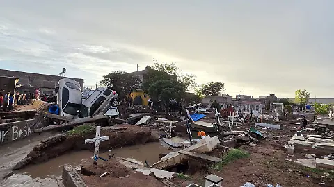 Los afluentes que corren a través de las viviendas de la colonia El Porvenir, provocaron el arrastre de vehículos por uno de los arroyos que se forman en la zona, que fueron agrupados unos sobre otros en las inmediaciones del panteón Municipal Número 3, ‘El Porvenir’, donde también se registró acumulamiento de material de arrastre, basura y varios artículos que fueron conducidos por la corriente. Las fuertes corrientes y el material de arrastre dejaron daños en la avenida de las Industrias y calle Desierto de Mojave, donde el agua arrasó con escombro y desprendimiento de pavimento, por lo que fue necesario el apoyo de vehículos 4×4 de Rescate Urbano y elementos de la Subdirección de Bomberos, quienes mientras realizaban los trabajos, se mantuvo la circulación vehicular cerrada.