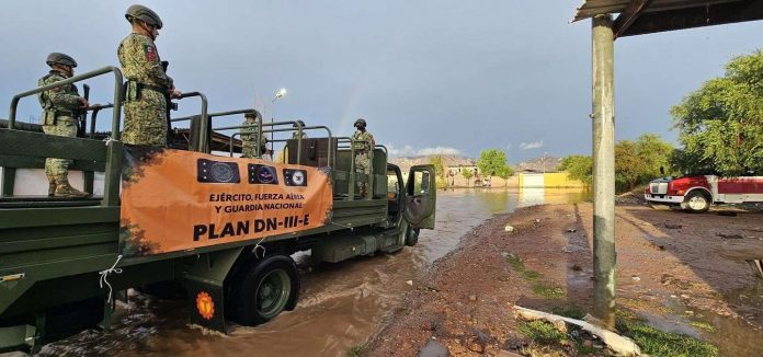 Chihuahua.– Después de las fuertes lluvias e inundaciones registradas en la ciudad, la Secretaría de la Defensa Nacional activó el Plan DN-III-E en su fase de auxilio a la población civil, con el fin de atender las afectaciones ocasionadas en diversas zonas habitacionales, especialmente aquellas de mayor vulnerabilidad.