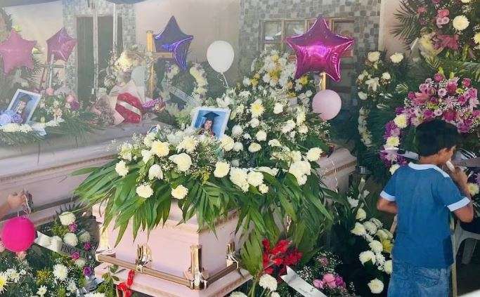 A un lado de las gemelas, en un féretro blanco, se encuentra Karla de nueve años de edad y enseguida, en un ataúd color azul, Margarita, la joven madre de las menores, de 28 años de edad.