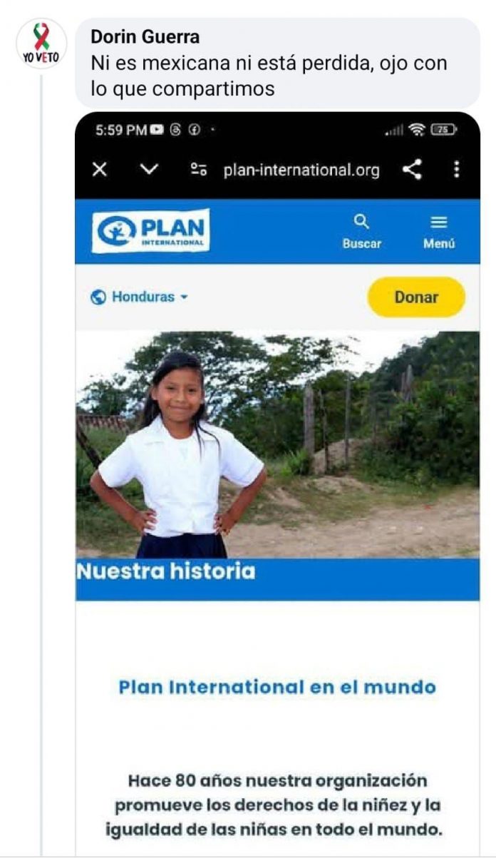 Así mismo, esta representación social, hace alusión a que la imagen de la supuesta niña utilizada es falsa ya que circula en Organizaciones de la Sociedad Civil donde piden donativos y no es de nacionalidad mexicana.