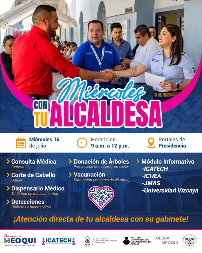 Meoqui.- El Gobierno Municipal de Meoqui invita a toda la ciudadanía a los Portales de Presidencia Municipal, donde se brindará atención directa sin previa cita por parte de la Arq. Miriam Soto y todo su gabinete en el programa “Miércoles con tu Alcaldesa”, que se llevará a cabo este miércoles 16 de julio en un horario de 9:00 de la mañana a 12:00 del mediodía.