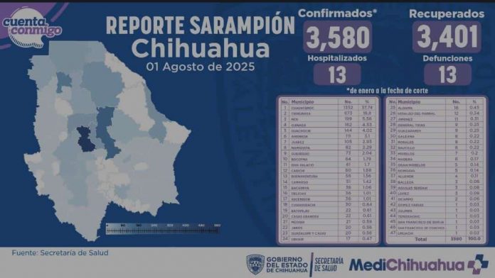 Chihuahua.– La Secretaría de Salud, a través del Departamento de Epidemiología, informó que en las últimas 24 horas se confirmaron 17 nuevos casos de sarampión en el estado, elevando la cifra total a 3,580 personas contagiadas en 47 municipios.