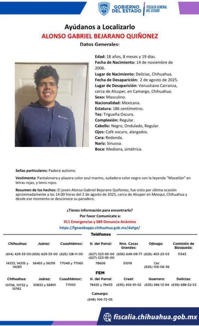Camargo.- La madre del joven de 18 años de edad, Alonso Gabriel, quien este lunes cumplió más de 48 horas de desaparecido, reveló que su hijo vino de vacaciones a Camargo.