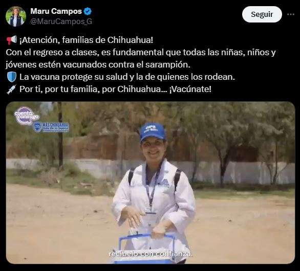 “Con el regreso a clases, es fundamental que todas las niñas, niños y jóvenes estén vacunados contra el sarampión. La vacuna protege su salud y la de quienes los rodean”, publicó Campos Galván en su cuenta de X.