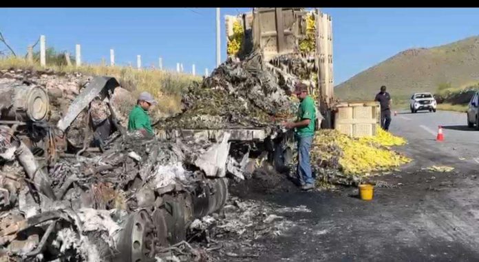 Delicias.- Un tráiler que transportaba toneladas de chile güerito se incendió de manera repentina, sobre el kilómetro 186 de la carretera que conecta a Chihuahua con ciudad Delicias.