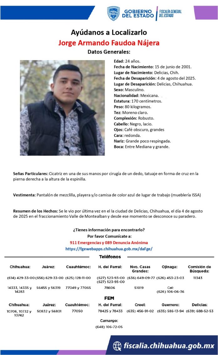 Delicias.- La Fiscalía General del Estado de Chihuahua solicita la colaboración de la ciudadanía para localizar a Jorge Armando Faudoa Nájera, un joven de 24 años que desapareció el 4 de agosto de 2025 en la ciudad de Delicias.