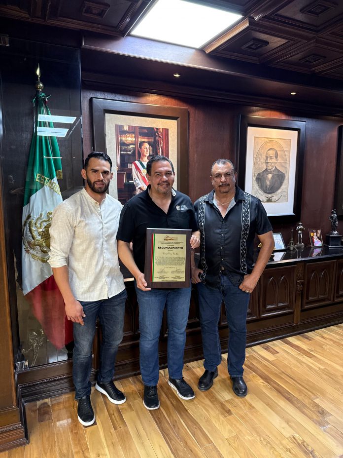 El alcalde recibió en su despacho al presidente en funciones del Colegio, Alejandro Salvador Cruz y al delegado estatal de Chihuahua, Juan de Dios Vázquez Quiñones, quienes le entregaron la placa en la que se destaca su labor por promover el deporte.