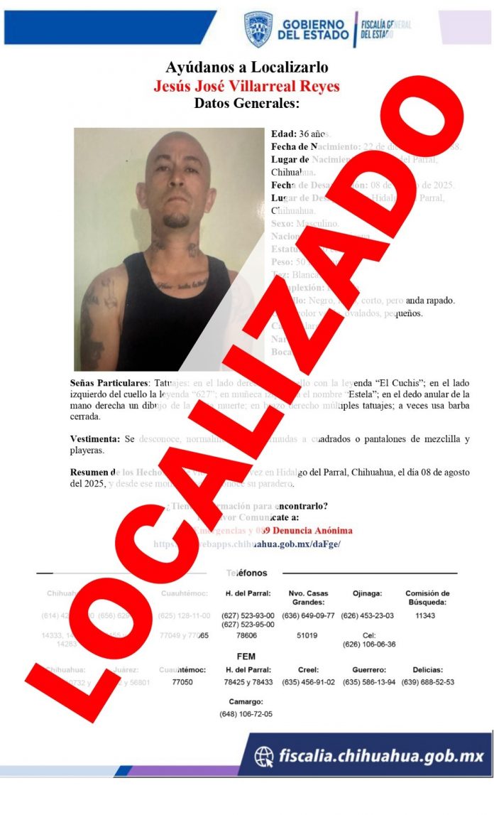 Delicias.- Elementos de la Agencia Estatal de Investigación adscritos a la Fiscalía de Distrito Zona Sur, localizaron sano y salvo a Jesús José V. R., persona que contaba con reporte de ausencia interpuesto por sus familiares el 08 de agosto del año en curso en la ciudad de Parral.