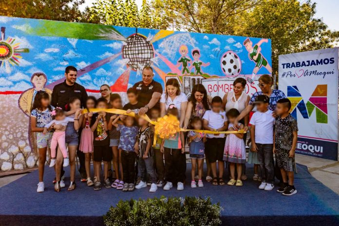 MEOQUI.- Con elementos como una bombera, escenas de los bailes, el parque de béisbol, la antigua estación de bomberos y el parque de la amistad, además de rendir homenaje al señor Lalo Gómez, la alcaldesa Miriam Soto y vecinos de las colonias San Antonio, Villezcas y Fraccionamiento González, encabezaron la entrega oficial del 3er Mural Vinculante en el municipio realizado en el Parque de la Amistad, esto como parte del Programa “Mi Barrio me Respalda”, el cual tiene como objetivo de fortalecer el tejido social y rescatar la identidad comunitaria, mediante estos murales que contienen detalles emblemáticos de cada colonia.
