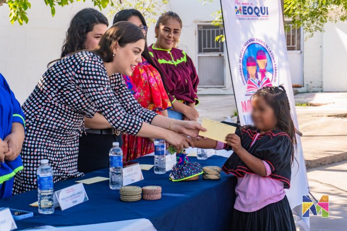 MEOQUI.- “La entrega de esta beca a 10 alumnos no es solo recurso o dinero, es una forma de incentivarlos y motivarlos para que sigan estudiando y se sigan superando”, así lo dijo la alcaldesa Miriam Soto, quien encabezó la entrega de las becas “Napawika Venebo” correspondientes al mes de septiembre a alumnos de la comunidad Rarámuri de la Escuela indígena Niños Héroes, buscando evitar la deserción escolar dentro de este sector de la población.