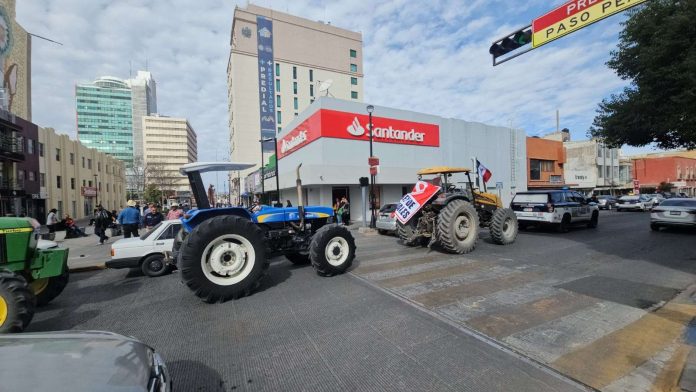 CHIHUAHUA.- Una comitiva de productores provenientes de la zona centro-sur del estado llegó esta mañana al Congreso del Estado para expresar su rechazo a la nueva ley relacionada con el tratado de agua internacional, la protesta involucra cerca de cuatro tractores y al menos 20 vehículos plantados en la calle Aldama y cercanías de la avenida Independencia, donde los manifestantes colocaron grandes lonas para visibilizar su inconformidad.
