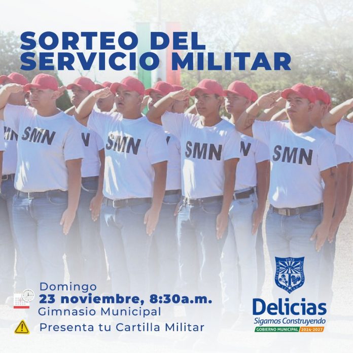 El Gobierno Municipal de Delicias anunció la realización del Sorteo del Servicio Militar Nacional, el cual se llevará a cabo este domingo 23 de noviembre a las 8:30 de la mañana en las instalaciones del Gimnasio Municipal. Este procedimiento forma parte de los requisitos oficiales para los jóvenes que tramitaron su cartilla durante el año.